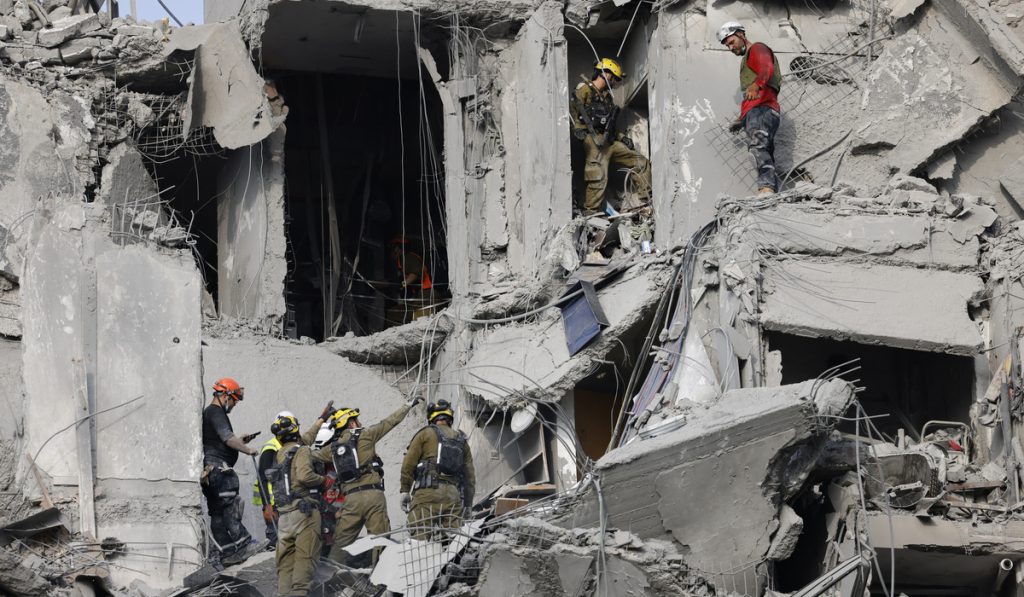 Emergency workers check the damage caused to a building from an Iranian missile strike in Beersheba in southern Israel on June 24, 2025. Israeli emergency services said on June 24 three people were killed and two wounded in an Iranian missile strike in southern Israel, shortly before a staggered ceasefire announced by US President Donald Trump was meant to enter force. (Photo by John Wessels / AFP)